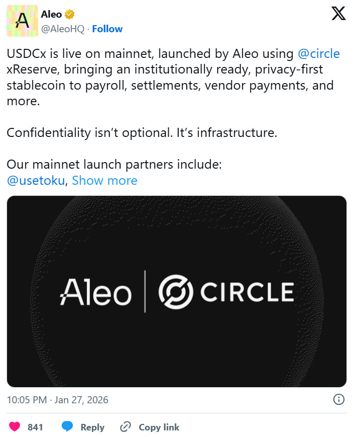 Recently, Aleo and Circle launched USDCx on mainnet, a USDC-backed private stablecoin designed to solve this problem. The partnership represents the first major stablecoin issuer backing a privacy-preserving dollar asset.