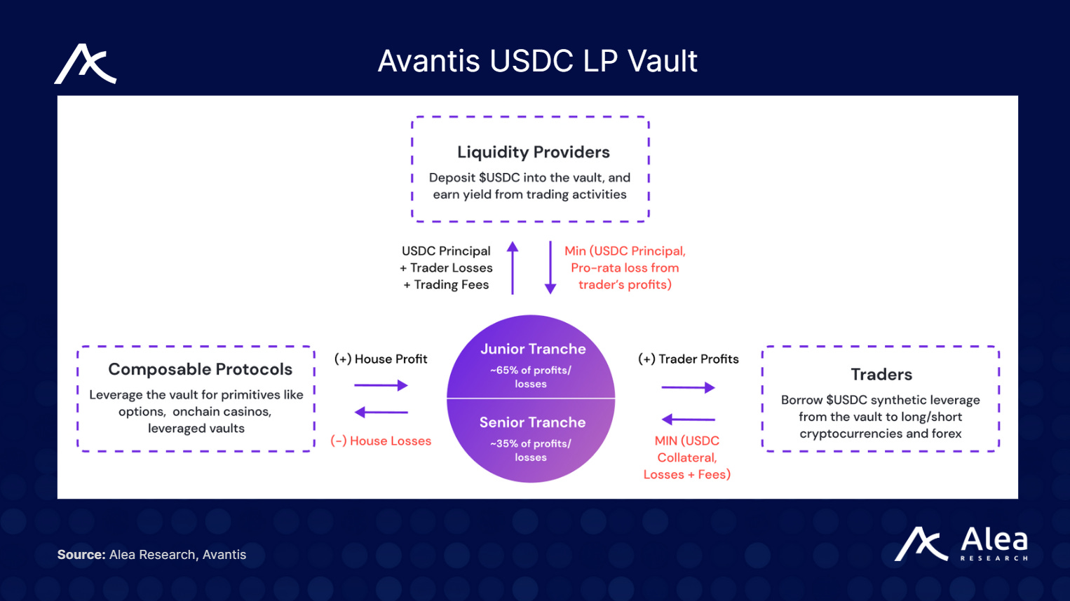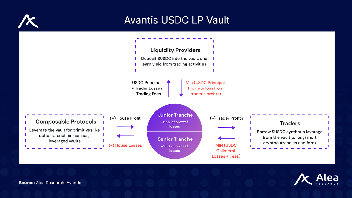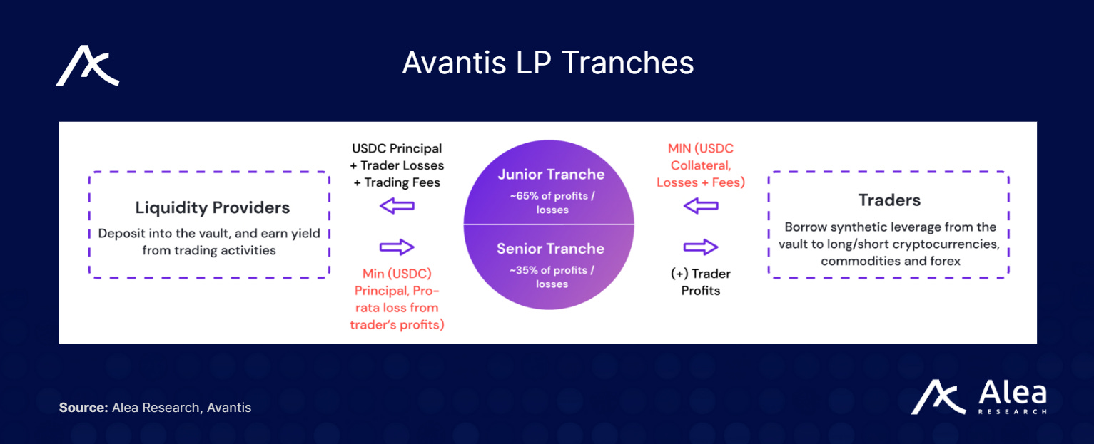Avantis introduces risk tranches and time‑lock parameters so LPs can choose their preferred exposure. LPs can deposit passively into the senior tranche or take more risk in the junior tranche, which has higher return potential but also absorbs a greater share of losses.