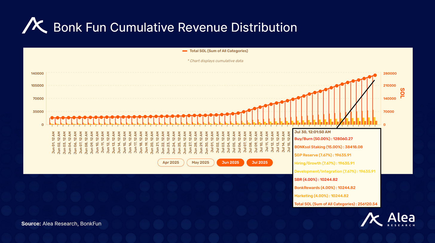 That revenue flow has become non-trivial (over 250K SOL to-date, ie. almost $50M) as BonkFun now sits in the same fee bracket (higher, even) as mid-sized Solana DeFi protocols. This is rare for something born from meme culture.
