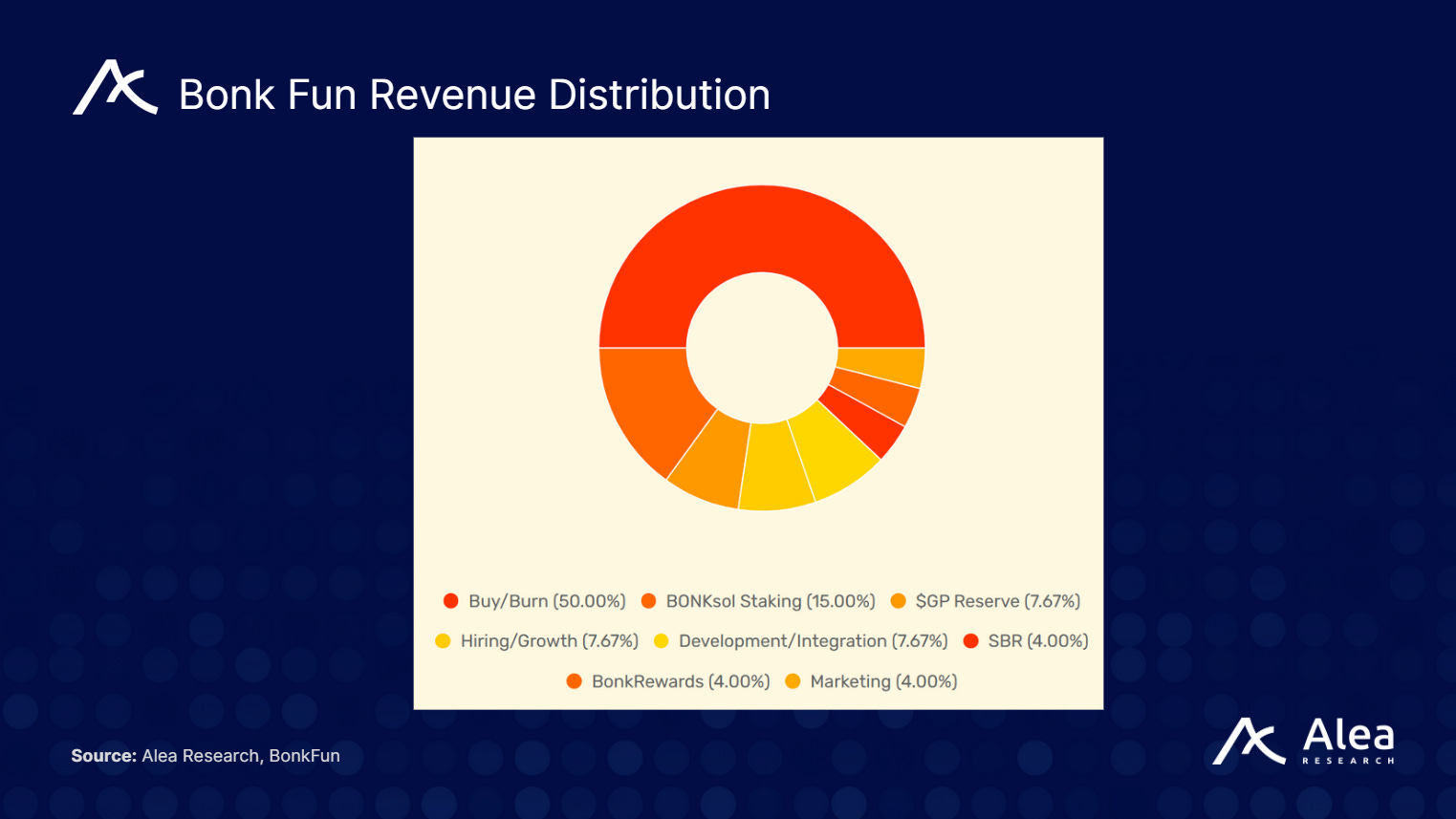 Majority of BonkFun’s revenue is allocated for Buybacks & Burns (50%), with close to $25M in SOL being used in the buyback & burn program to-date. On top of that, 15% of all fees generated by BonkFun is staked in the form of $SOL in the BONKSol validator, contributing to securing the Solana network by staking almost 40k $SOL
