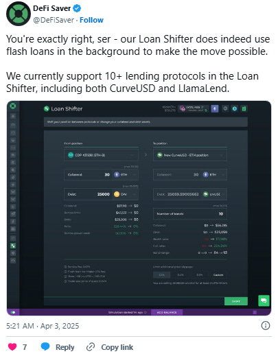 Using Aave through DeFi Saver - Loan Shifter and Collateral & Debt Switch use flash loans and routing under the hood to swap collateral or debt within Aave in a single transaction, while showing before/after collateral, borrow limit and safety ratio so you can see the effect on risk.