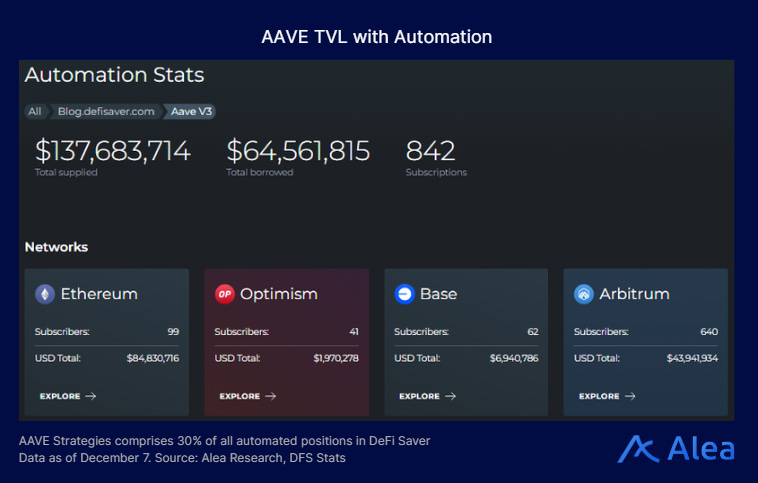Aave is a natural focal point because it is one of DeFi’s core money markets by both usage and capital. Aave is one of DeFi Saver’s most active integrations, and much of the project’s automation tooling was built with Aave-style lending in mind. Currently, the TVL automated in Aave strategies comprises 30% of total USD ($137M).