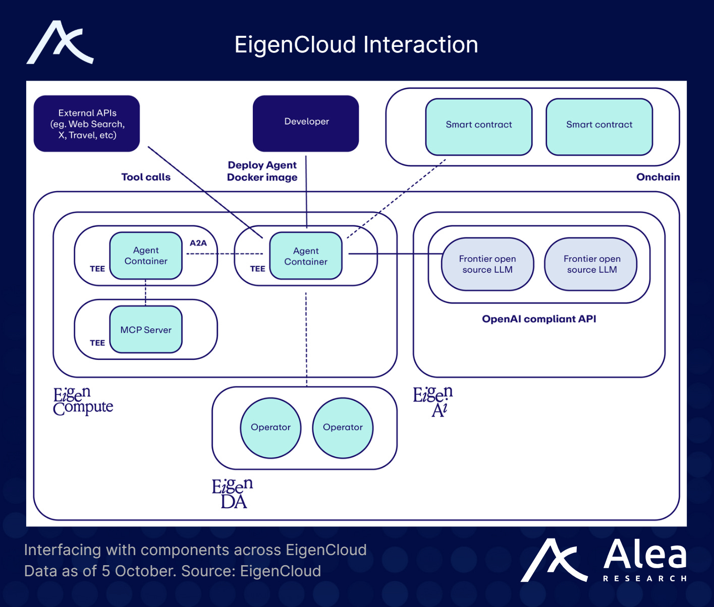 Agent‑to‑Agent payments: EigenCloud is working with Google on an Agents Payment Protocol (AP2) that standardizes how on‑chain agents pay each other, building on Google’s A2A protocol.