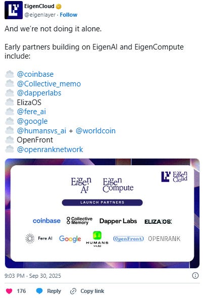 Recently, EigenCloud was unveiled as a pivot toward a cloud‑style service provider model where AI agents and complex apps can run off‑chain yet still inherit the transparency and slashing guarantees that restaking offers.