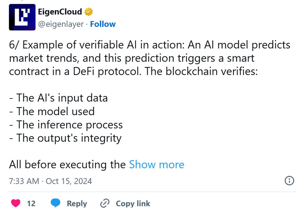 EigenCloud addresses this by combining deterministic inference, secure off‑chain execution and cryptoeconomic security. Developers can now run complex AI agents off‑chain but still prove their correctness, thanks to slashing, auditing and in the future, zero‑knowledge proofs. This turns AI and compute into transparent processes which enable agentic applications that can manage capital, negotiate trades or run games with the same assurances as smart contracts.