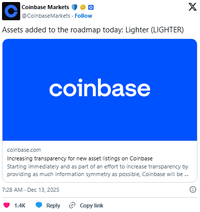 On December 13, Coinbase announced Lighter is added to the roadmap.