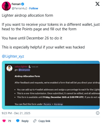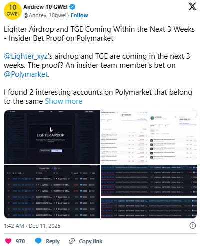 Lighter’s official X has gone without an update since Dec 7, but plenty of other channels have signaled an impending $LIT airdrop along with potential details that the market is pricing in.