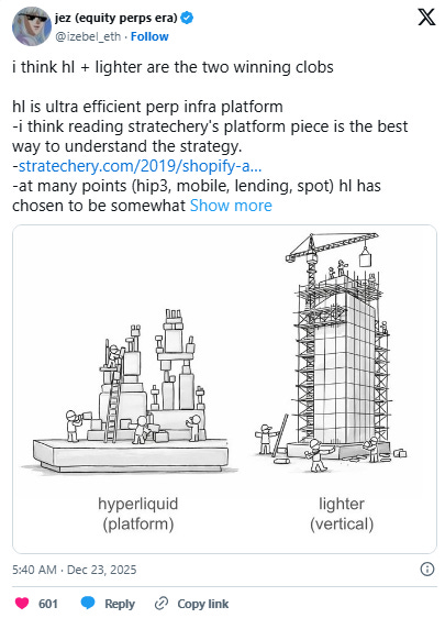 In practical terms, Hyperliquid competes horizontally on network effects: liquidity depth, product breadth, and distribution, while Lighter is trying to scale vertically and compete on verifiability and fault tolerance (i.e. making it harder for the venue to behave unexpectedly, and making exit conditions clearer under stress).