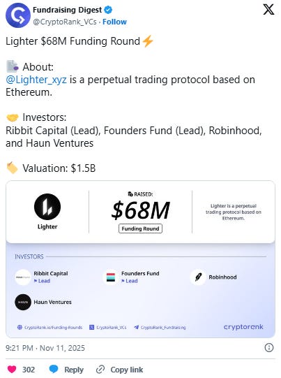 Large bets have also been placed in Polymarket’s Lighter’s FDV one day after launch. This market automatically resolves “No” if it doesn’t launch by December, potentially suggesting an impending airdrop in the next week or so.