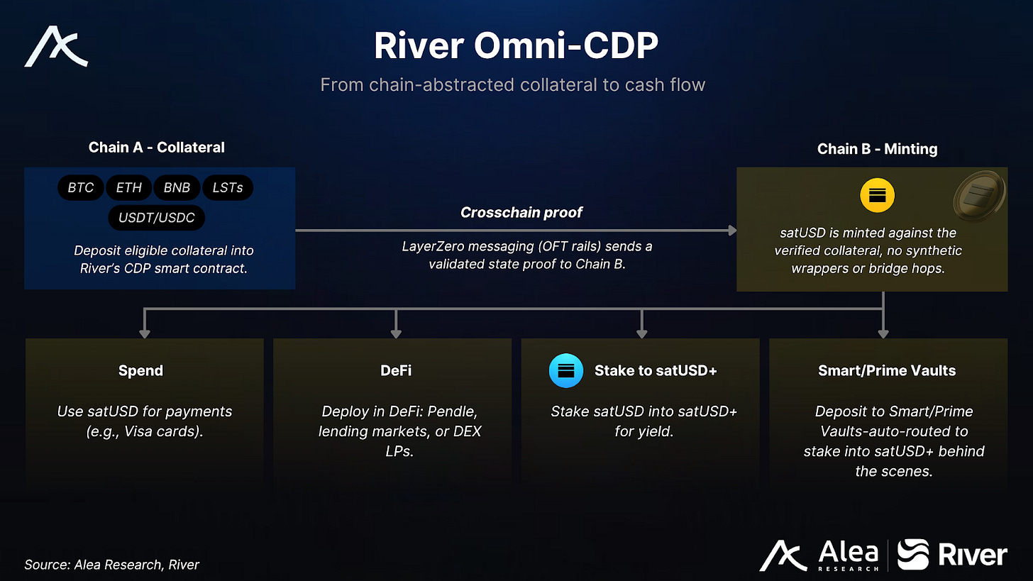 At its core, River is building a chain‑abstraction stablecoin system. Users deposit collateral (BTC, ETH or stablecoins) on one chain and mint satUSD on another using LayerZero’s omni‑fungible token (OFT) standard. This removes bridge hops and wrapper risk, addressing the liquidity fragmentation that plagues multichain DeFi.