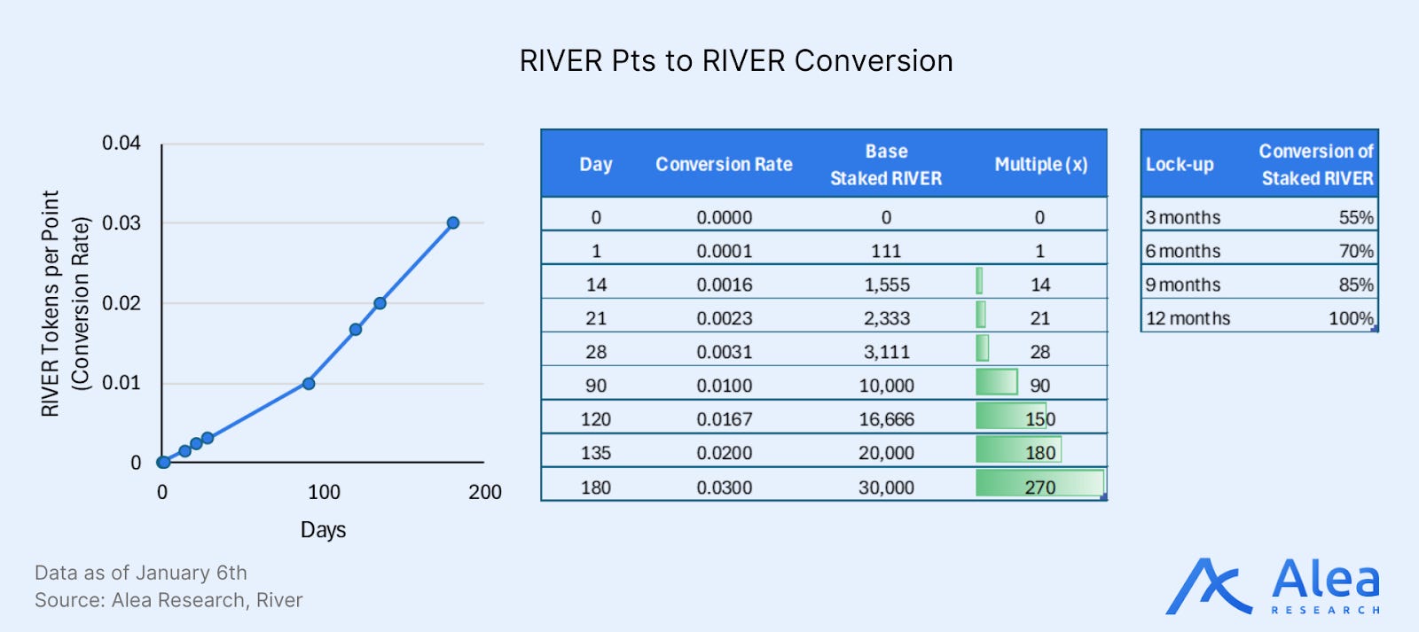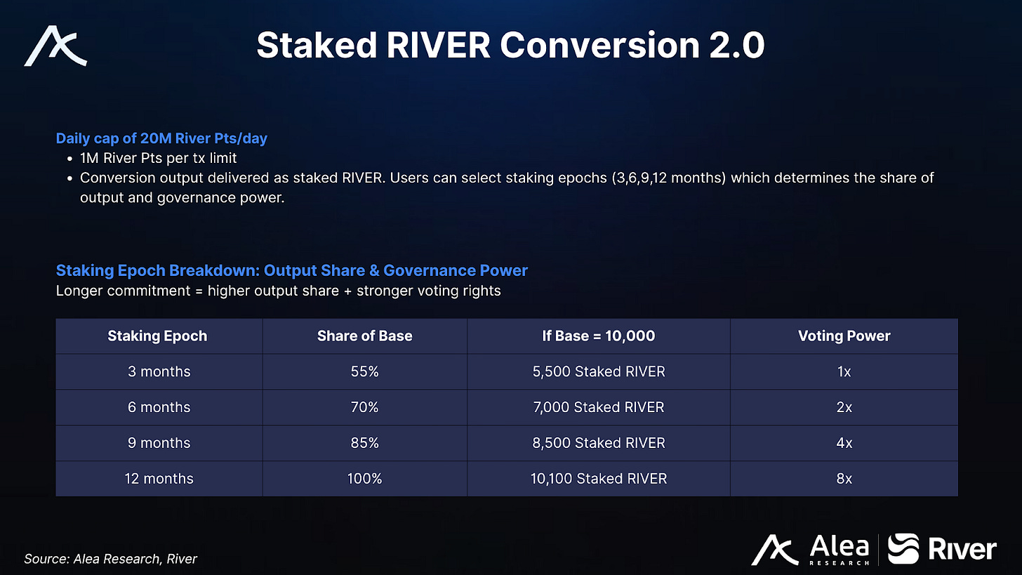 The later points are converted, the greater the exchange rate. A total of 1B River Pts correspond to up to 30M staked RIVER over the 180-day window. Staked RIVER redemption comes with epoch selection (3 months captures 55% of base, 12 months captures 100%) so longer lock-ups compound the time-curve benefit.