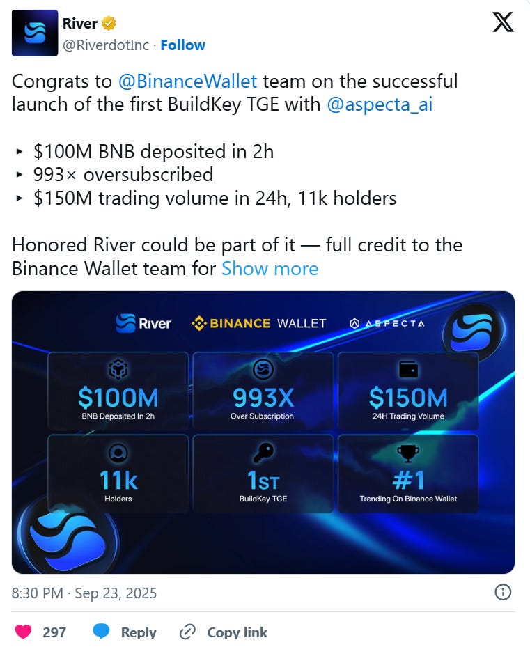 The BuildKey TGE in Binance Wallet set a new record in its IDO history with $100M in BNB committed in less than 2 hours from 30k+ users (993x oversubscribed).