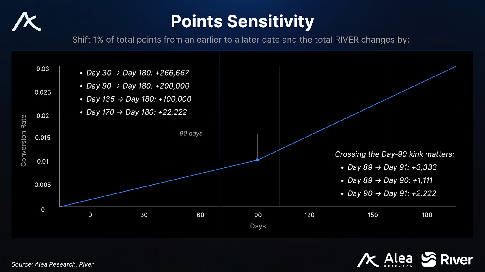 Day 90 (~Jan 24, 2026): Baseline slope doubles. Holding past this threshold yields ~222 RIVER/day per 1M Pts vs ~111 before.