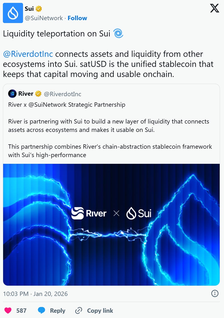 River has secured Tier-1 CEX listings and Binance perps, OKX perps and boost, and Kraken spot, operates across 8+ chains, and sustains $320M+ in TVL with 200M satUSD in circulation across integrations such as Pendle and MEV Capital curated vaults. They also recently listed on XLayer.