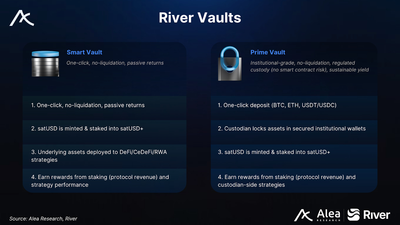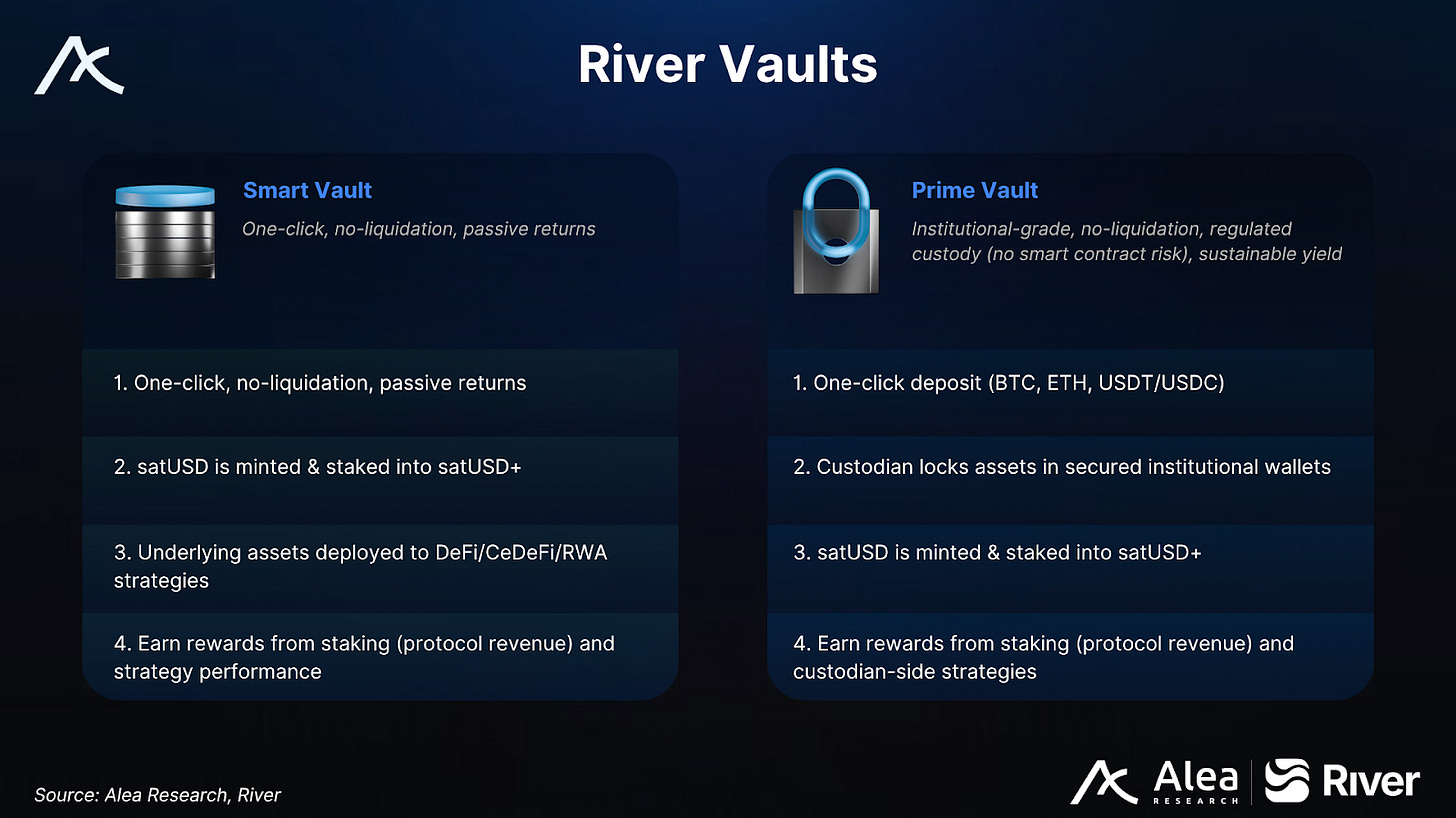 Prime Vaults provide custody-oriented rails connecting River’s yield to external custodians and institutional controls for larger treasuries.