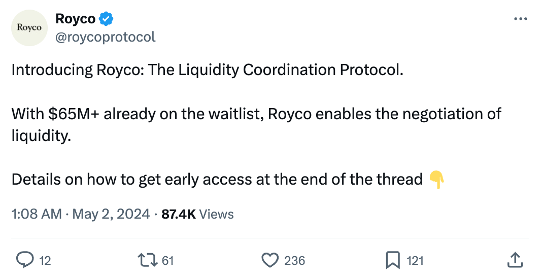 Early last month, Royco rolled out their project waitlist, allowing users to get certain access and priority levels based on their wallet status. Users can connect more assets to get access to Royco first. The team quickly has seen registrations totaling over $670M in user-controlled assets, with over 5,000 users. Note that this is not TVL, simply the value of assets in wallets connected to the platform. There is also a referral program currently live, with notable users of the Royco platform in Sam Kazemian, Smokey the Bear of Berachain, and more.