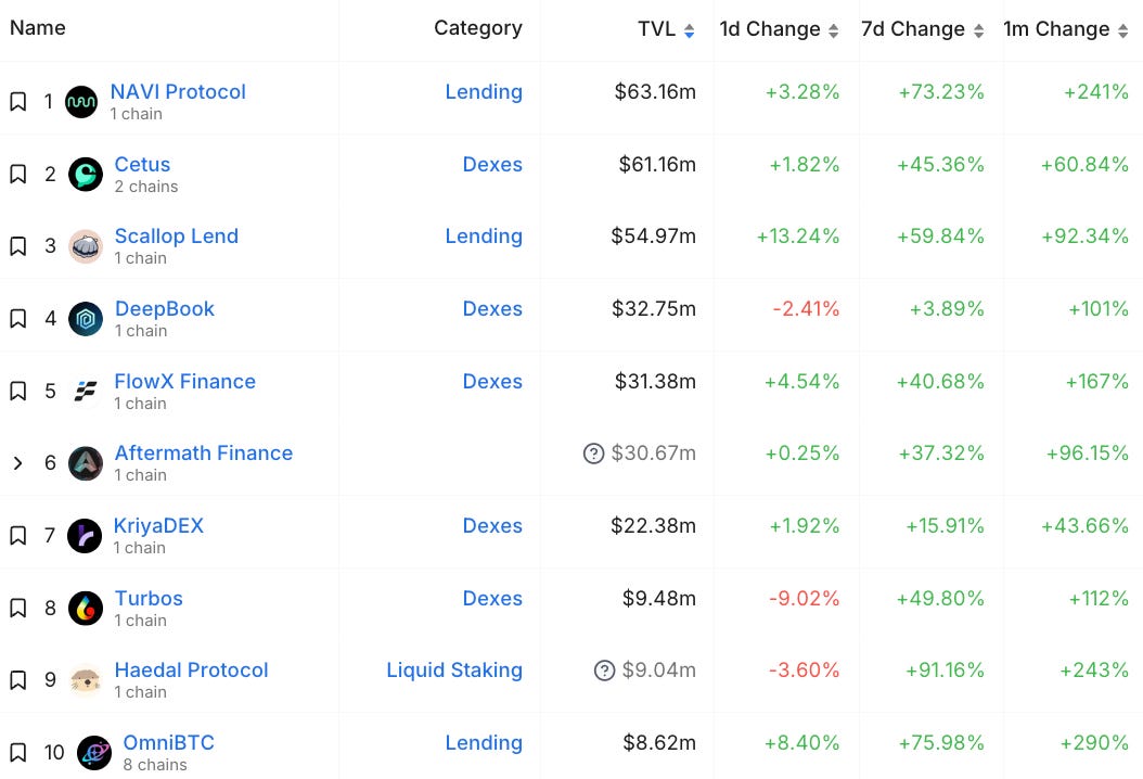 TVL growth of top 10 Sui protocols