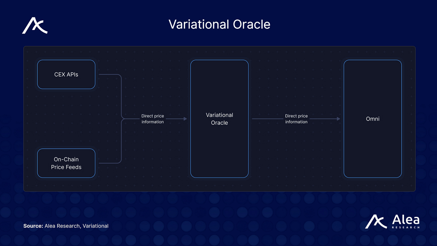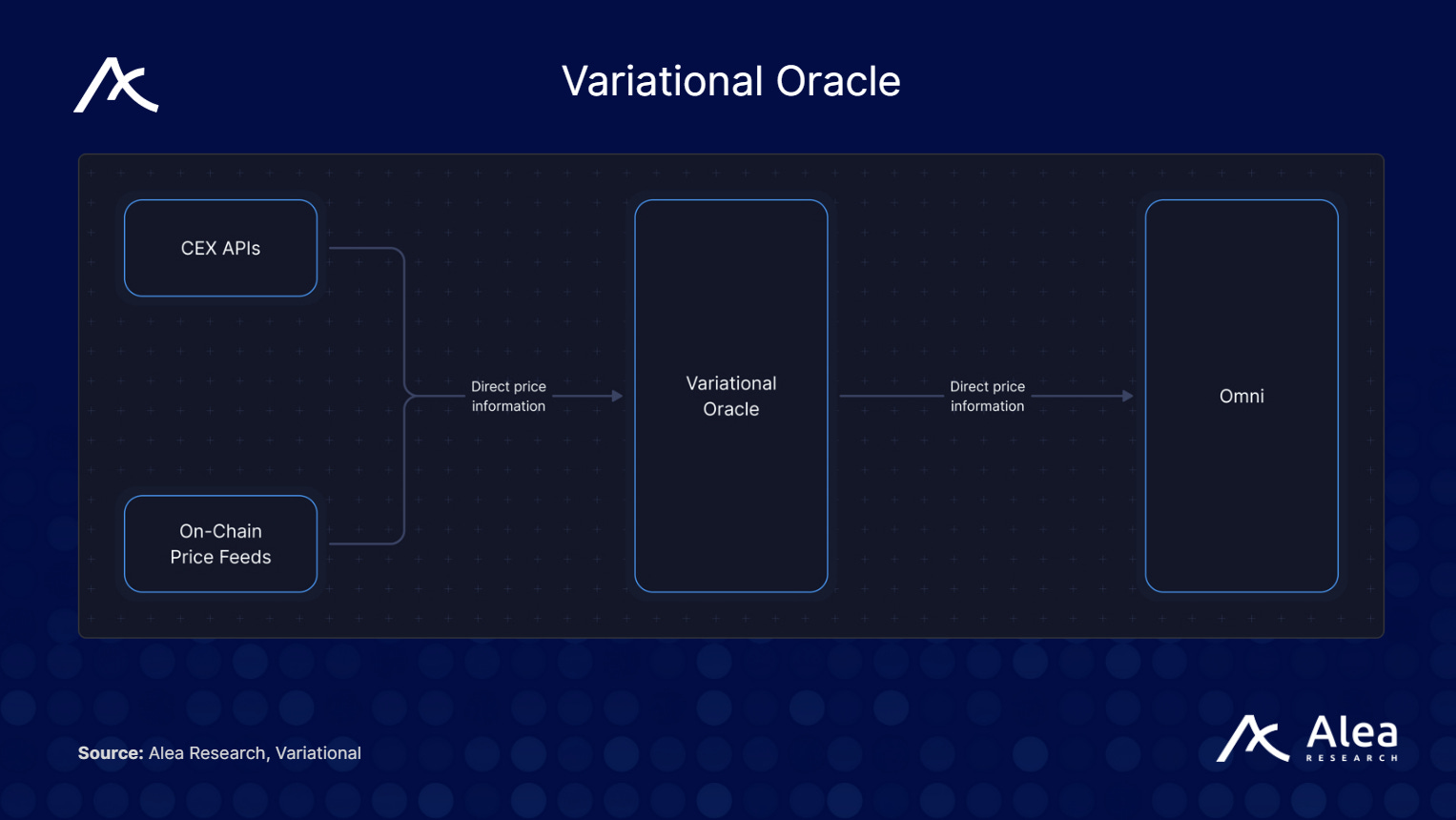 Another key enabler for permissionless derivatives is the Variational Oracle, an in‑house price feed that aggregates data from both centralized and decentralized exchanges. For tokens with sufficient CEX listings, the oracle uses a weighted combination of prices to guard against manipulation. For long‑tail assets without CEX listings, it falls back to on‑chain data from AMM pools across blockchains and rollups.