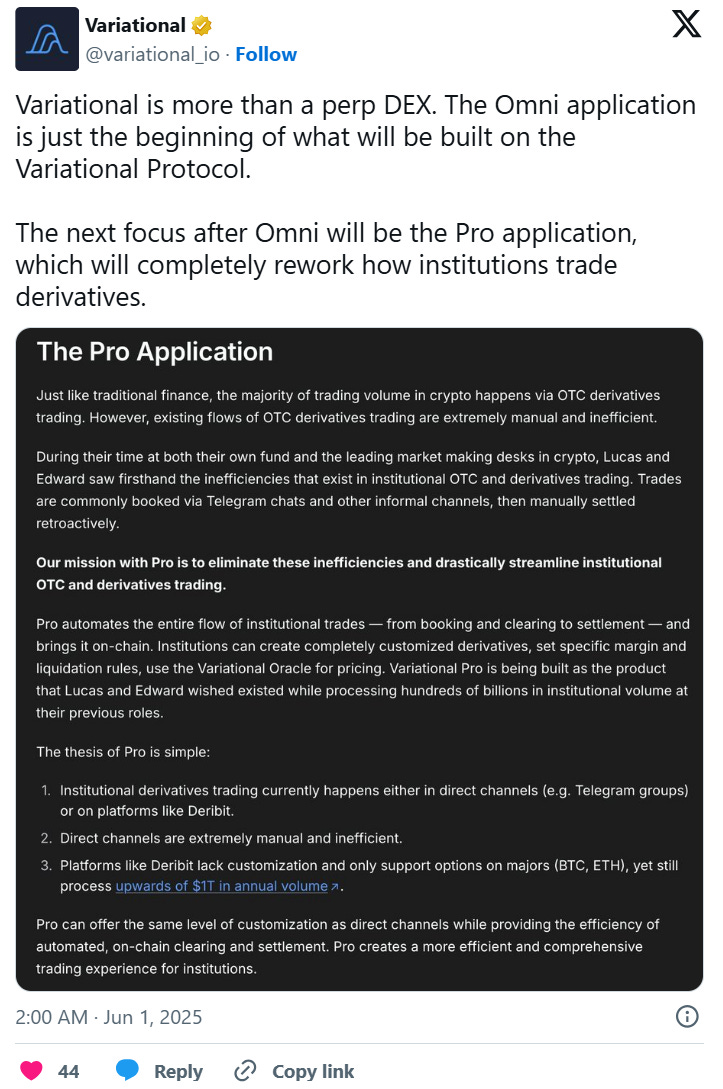 Variational aims to solve these inefficiencies by building a protocol that enables non‑custodial bilateral trading with segregated risk, automated settlement, and a vertically integrated market making vault. This architecture supports both retail and institutional use cases through two flagship applications: Omni for permissionless perpetuals trading, and Pro for custom OTC derivatives.