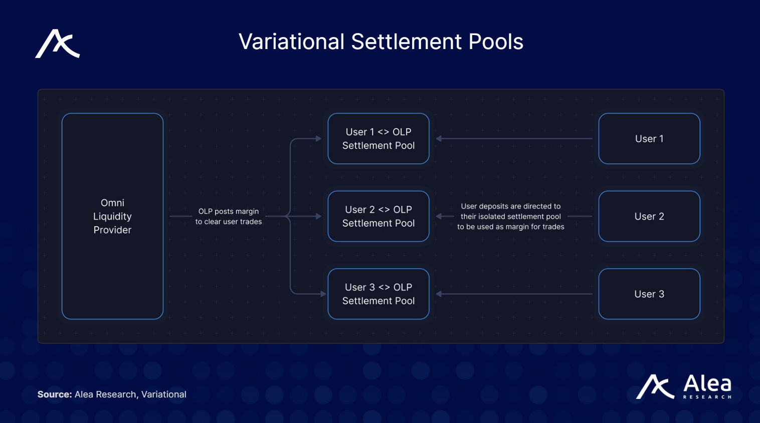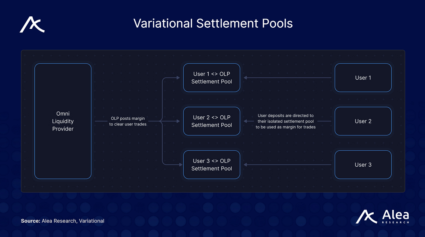 Variational instead uses segregated settlement pools, which are smart contracts that contain positions, collateral and margin rules for each pair of counterparties. Each user on Omni has their own bilateral pool with the Omni Liquidity Provider (OLP). This design eliminates contagion: the bankruptcy of one pool does not impact others.