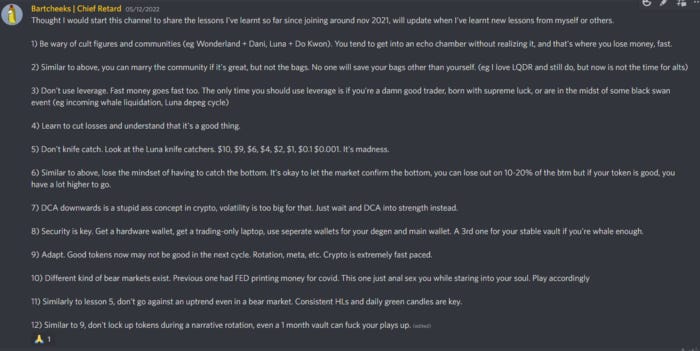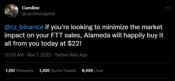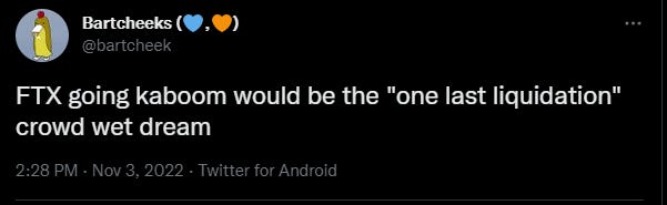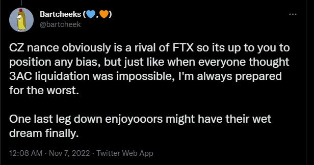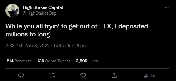 I think even if you’re a big trader who needs to deploy in the millions and got caught with your pants down on FTX, what happened to your size and risk management? If you’re trading in millions and that’s your entire net-worth, what are you doing trading your entire net-worth at one go? Even a 50% trading size is crazy to me. An established trader who should have proper risk and size management who have still hurt, but at least the majority of their net-worth would either be in their wallets or in banks because they aren't trading EVERYTHING AT ONCE.